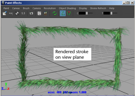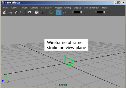 You can only paint on the view plane in the scene painting view—not the scene view. When you paint on the view plane in the scene painting view, each stroke renders on the view plane, as you would expect. However, the wireframe representation of each stroke displays between 0 and 1 in world space on the XY plane (near the origin). Although the wireframe representation of the strokes appear to overlap in this area, the rendered strokes display where you painted them.