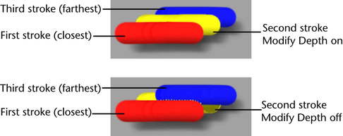 Depth must be turned on to use this option. Turn on Modify Depth to paint to the depth channel. If a stroke has a depth channel, but Modify Depth is off, the stroke appears behind strokes that are nearer in the scene and strokes that were created after it, as shown in the following example.
