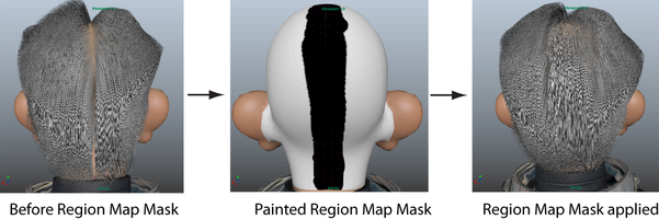 After creating the hair part, you may need to create a Region Mask to override the part along the back of the head. This way, the part starts at the front hairline and stops at the crown of the head. To do this, use the same technique as creating a hairline (see Create hairlines and bald spots using Ptex maps).