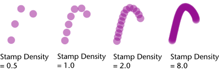 If you set Stamp Density to 1, the paint path will look like a line of circles that just touch on the edge. If you set Stamp Density to be greater than one, the circles will overlap by a factor of their width (for example, if Stamp Density is 2, the stamps will overlap by half their width). If you set Stamp Density to be less than one, there will be spaces between the stamps.