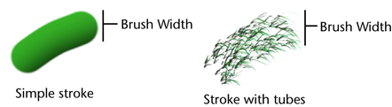 Defines the width of the brush in Maya working units. For simple strokes, the brush width defines the width of the paint stamps applied along the stroke path. For strokes with tubes, the brush width defines the stroke path boundary—tubes can start growing only within the path defined by the brush width. The Paint Effects Tool cursor is a brush stamp outline. The Brush Width is represented by the diameter of this outline.