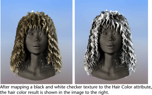 Use the Hair Color map button next to this attribute to map a texture to the hair color to create different hair shading looks. The following image uses a black and white checker texture mapped to the Hair Color attribute.
