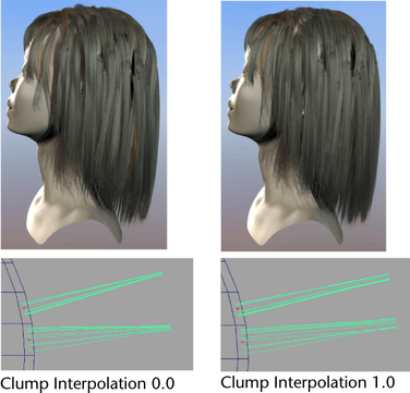 This attribute has an overall effect on all the hair clumps of your current hair system. The effects of this attribute are more apparent with higher Clump Widths than with lower Clump Widths. Clump Interpolation is 0.0 by default.