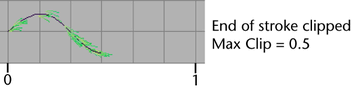 Max Clip—Specify the point along the stroke that defines the end of the stroke segment. When the Max Clip value is 1, the end of the stroke is not clipped.