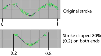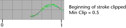 Min Clip—Specify the point along the stroke that defines the beginning of the stroke segment. When the Min Clip value is 0, the beginning of the stroke is not clipped.