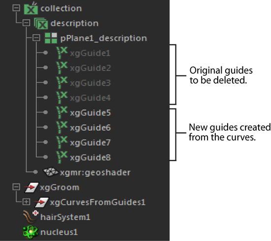 Maya converts the dynamic curves to new guides and hides the original guides. The new guides inherit the curves dynamic properties.