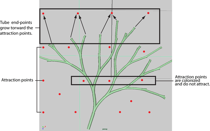 Occupy Attraction influences tube end-points of the stroke to grow toward the attraction point until a tube occupies the region around it. When a tube-end of a branch point reaches an attraction point, the point's attractive force is turned off. The point no longer attracts other tube-end points and is considered colonized by the branch.