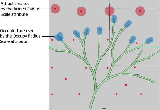 To simulate space colonization in Paint Effects, points on the surface of painted objects (Occupation Surface) and inside Line Modifier shapes ( Occupation Volume) generate an attractive force called Occupy Attraction.
