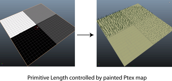 You can also paint different colors on the mesh to specify distinct areas on the surface. Use this type of Ptex map for region map. See About region maps and masks.You can vary the value of an attribute, such as Length, by painting grey.