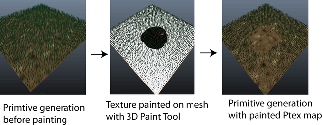 You can use Ptex files with XGen Descriptions to specify the location and density of primitives as well as to control a number of primitive attributes. Ptex files are overlaid on the polygon mesh as maps. You can create Ptex maps using Ptex painting in Maya or by using a Ptex file created in Autodesk Mudbox 2012 (or later). In Maya, you can use the Paint 3D tool to paint textures, which generate Ptex files when saved by XGen.