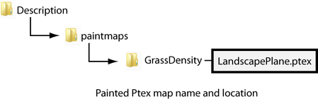 When you create a Ptex map in Maya, the Map Name you specify is assigned to the folder name that contains the Ptex file. The Ptex file name is derived from the polygon mesh object you paint on. Maya stores the Ptex folder and file in a paintmaps folder, which is stored in the Description directory. For example, if you painted a map named GrassDensity on a polygon mesh named LandscapePlane, the folder and file structure appears as: