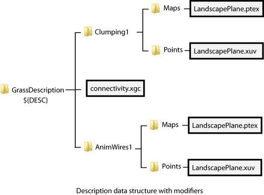 XGen uses the same data structure for the Ptex maps generated by XGen modifiers, such as a clumping map created by the Clumping modifier. For example if you added Clumping and AnimWire modifiers to the GrassDescription Description, Maya generates the following default data structure: