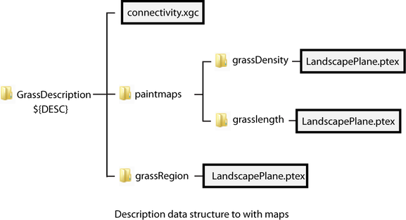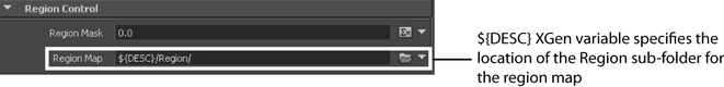 When you paint Ptex maps for attributes, such as Mask or Region Map, to control primitives, Maya creates sub-folders inside the Description for these Ptex files. The data path connecting the maps with Description is specified by the ${DESC} XGen variable. This ensures that all Ptex files are correctly sourced by the Description.