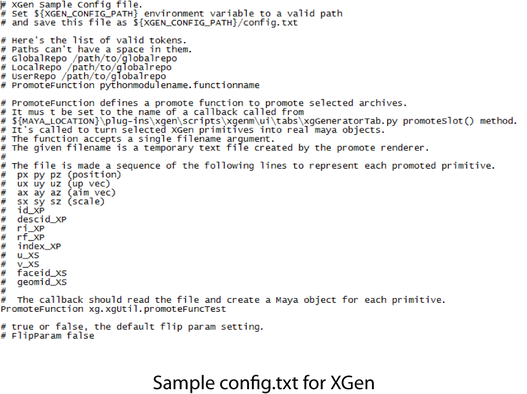 By default, XGen uses the XGEN_CONFIG_PATH environment variable for configuring file locations. It must point to a directory containing a config.txt properties file. The following image is an example config.txt: