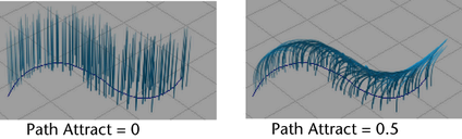Defines the magnitude of the force that attracts tubes to the stroke path at each step of the growth simulation. If the value is 0, no force is applied to the tubes. As the value increases, the tubes converge onto the path. A positive value attracts tubes while a negative value repels them.