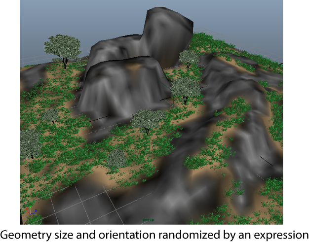 You can also use the randomizer() expression to vary the size and orientation of the grass clumps in the scene.