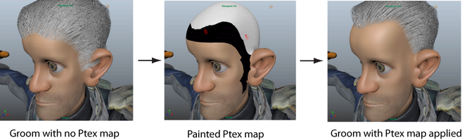 You can create a Ptex-based map to mask out areas of your character mesh that you do not want hair or fur to appear. Follow this example to create a Ptex-based mask to define the hairline on a partially groomed character. Yon can use the same technique to create bald spots.
