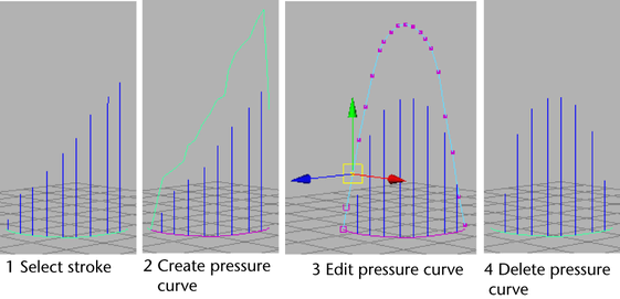 Paint Effects assigns pressure values to UV points on the underlying stroke path curve. These values are stored with the stroke. You can adjust each value individually in the