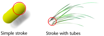 Paint Effects Tool is selected automatically. The cursor shows the width of the stroke path. For simple strokes, the brush width defines the paint stamp. For strokes with tubes, the brush width defines the stroke path boundary—tubes can start growing only within the path defined by the brush width.