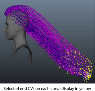 When styling nHair, you often need to select a group of curves CVs to which you want to apply nConstraints. For example, to position hair curves, you may need to select the end CVs on each curve for a Transform constraint. Be aware that the components available to be selected depend on the current display of the hair system. Set the display to the curves' current position by selecting nHair > Display > Current Position.