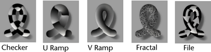 This option is used only when Map Color or Map Opacity is turned on. Select the type of texture you want mapped to Color and Opacity. You can map Checker, U Ramp, V Ramp, Fractal, and File type textures. For more information on mapping file type textures, see Map file textures to color and opacity.