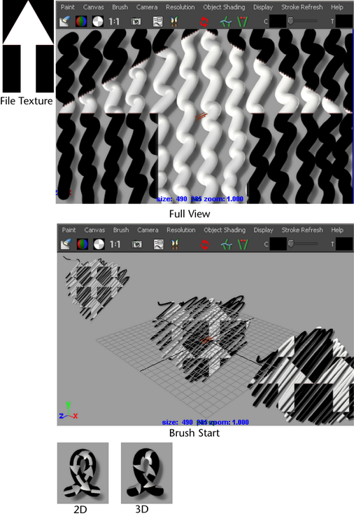 The mapping is in “eyespace,” similar to Full View, but the position, scale, and offset of the texture is based on where the brush stroke starts. This texturing technique works best in scenes with Paint at Depth turned on for the brush. If the brush stroke starts far away in the scene, the texture is small. The closer the brush stroke starts, the larger the texture.