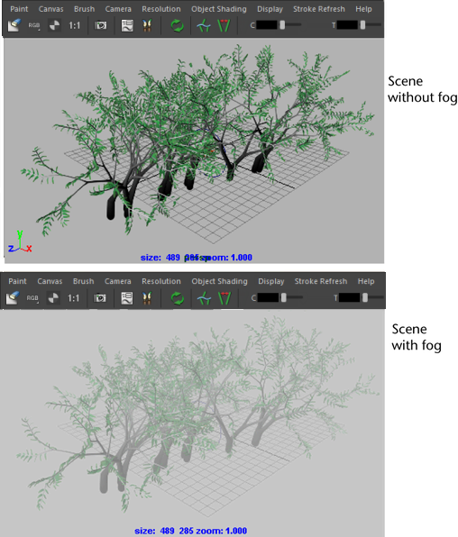 You can use environment fog to simulate the effect of atmospheric particles. If you use Physical Fog in your scene, you can display it in the scene painting view to see how the Paint Effects strokes look in a rendered fog environment. For information on using Physical Fog, see Atmosphere.