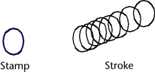 Clicking the brush on a surface creates a stamp. A stroke (created by dragging across the surface) is made up of many overlapping stamps.