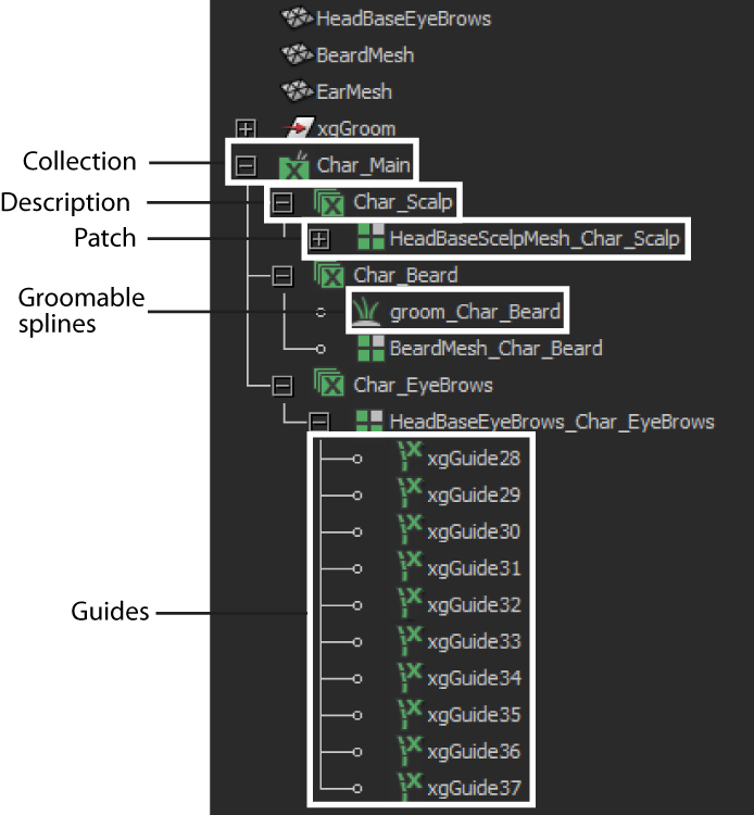 If there are no Collections in a scene when you create a new Description, XGen creates a Collection. Maya saves Collections as XGEN files. Collection files store information about the contained Description such as attribute values, Ptex map locations, face ID's for patch bindings and guides, and render settings. Collections are the highest-level element in the XGen hierarchy and can contain the following: