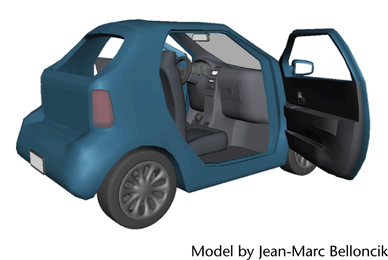 For the car model pictured, the asset encapsulates group nodes for the car body, interior, axles, lights, and doors.