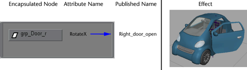 Like publishing attributes, you can publish a node to an asset. For either type of asset, published nodes are the only encapsulated nodes that can be seen (in the Outliner, Attribute Editor, and Channel Box), selected, and manipulated when an asset is in Black Box mode.