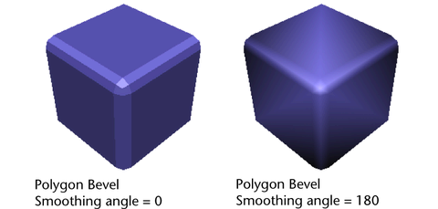 In general, if the angle between two shared edges is greater than the value specified by the Smoothing Angle attribute, the beveled edge will be shaded to appear hard. The default Smoothing Angle value is 30 degrees.