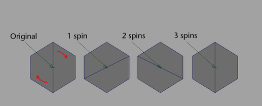 You can spin an edge forward or backward based on its winding direction. If you spin an edge that was spun before, or spin an edge multiple times, Maya edits the offset attribute of the existing history node rather than creating a new one.