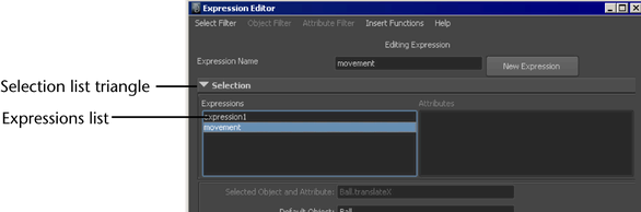 The Expression Editor displays a Selection list by default. This list displays either a list of objects and attributes, or a list of expressions you’ve created.