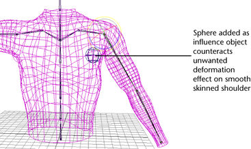 An important use of influence objects is to prevent unwanted deformations from occurring. After smooth skinning, you may find that certain areas deform more than you would like. For example, deformations around a shoulder may be too extreme when you rotate the shoulder joint.