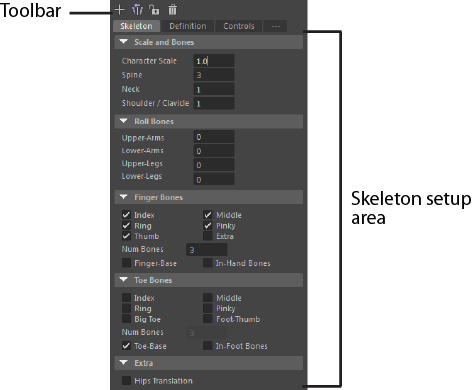 This tab lets you create a skeleton for your HumanIK characters. The Skeleton tab has the following main areas: