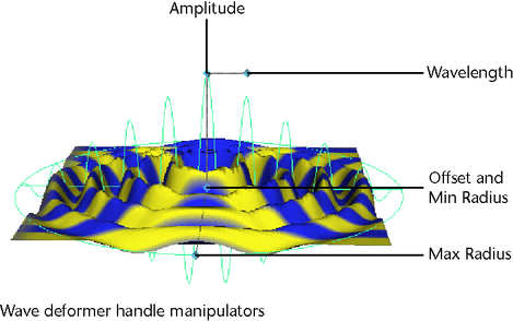 You can edit the effects of the wave deformers by editing the wave handle node and the wave deformer node. You can move (translate), rotate, and scale the wave handle to edit the effects of the deformation. You can also edit the wave deformer node’s keyable attributes (channels), which are displayed in the Channel Box.