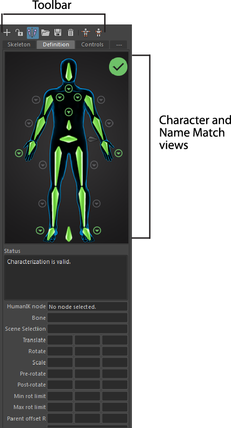 The Definition tab provides a visual interface for mapping the structure of your existing skeleton. This process results in a HumanIK skeleton definition that is required to create a Control rig .