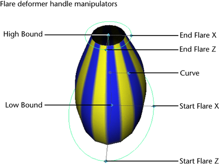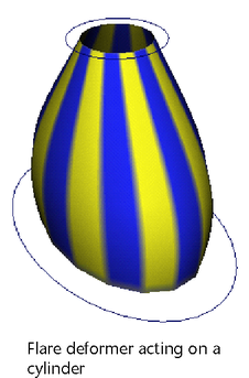 Flare deformers let you flare out or taper in any deformable object along two axes. They are useful both for character setup and modeling. Flare deformers include handles that let you to control the extent and curvature of the flaring or tapering effects in an intuitive manner.