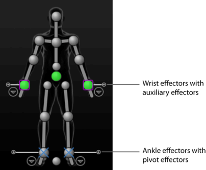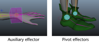 You can add auxiliary and pivot effectors to a character’s Control rig to provide another level of IK control. See also