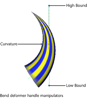You can edit the effects of the bend deformer by editing the bend handle node and the bend deformer node. You can move (translate), rotate, and scale the bend handle to edit the effects of the deformation. You can also edit the bend deformer node’s keyable attributes (channels), which are displayed in the Channel Box.
