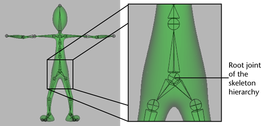 The root joint is the highest joint in a skeleton’s hierarchy. A skeleton can have only one root joint. You can move and orient the entire skeleton in world space by translating and rotating the root joint.