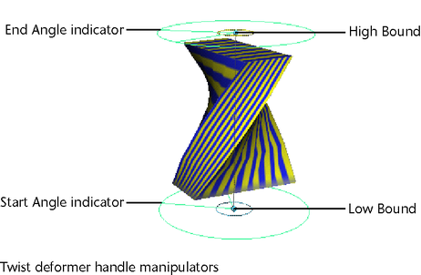 After you create the twist deformer, its handle is displayed in your scene and its nodes are listed in the Channel Box. The nodes include the twist handle node (default name: twistnHandle), the twist handle shape node (twistnHandleShape), and the Twist deformer node (default name: twistn).