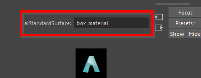 A new shading material is created and assigned to the cracker box. The Attribute Editor appears and displays the various attributes for the new shading material in the aiStandardSurface1 tab.