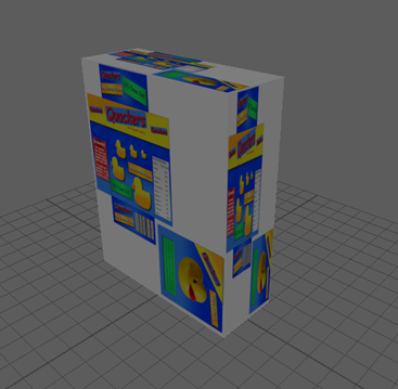 The texture map does not appear correctly on the cracker box model because the default UVs for the cube primitive don’t correlate to the texture map properly. The texture map was designed so that specific sides of the box receive specific regions of the image. Right now, the complete image is being placed on every side of the object.