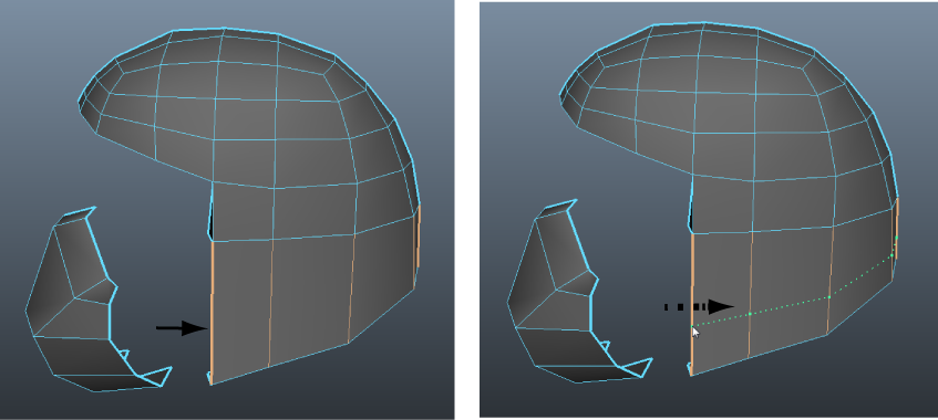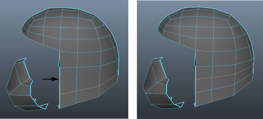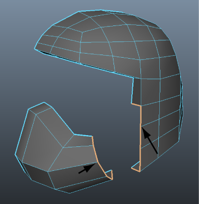 Next you’ll connect the lower front region to the helmet mesh. You can create meshes that bridge between one or more border edges of a mesh using the Bridge feature in the Modeling Toolkit.
