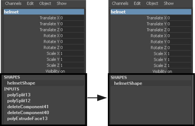 The construction history is deleted on the helmet mesh. Notice the list of items under Inputs has only one item remaining—the polySurfaceShape node.