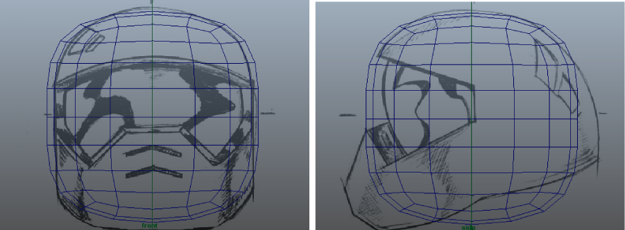 If the top, domed portion of the smoothed cube doesn’t roughly match the helmet sketches as indicated in the image below, scale both images with the Scale Tool to make it match. Do not scale the cube, as later steps will provide numbers based on the cube's current size.