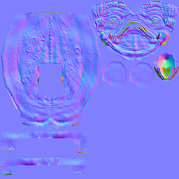 A normal map differs from a texture map in that it produces a multi-channel image (shown below) based on the normals of the high resolution (source) mesh. This information is used to light the mapped details on a low resolution (target) mesh convincingly, even though the surface itself is relatively flat.