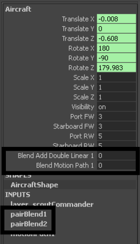 The animation stops because the motion path animation was shut off when the blend attribute was automatically created when you set the first keyframe. The blend attribute values are set to zero by default. When the blend values are set to zero, the keyframe animation has full influence on the object, and the path animation is shut off. When the blend values are set to one, the motion path has full influence on the object and the keyframing is shut off. When the blend values are between zero and one, the aircraft’s motion is blended between the keyframe and motion path animation.
